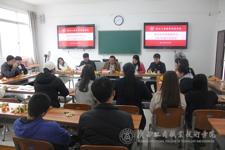 2017年1月12日中午,学院党委宣传部新闻中心在学院校本部召开2017年新年座谈会,学院党委副书记、纪委书记蒙启成,学院党委宣传部部长韦胜强、党委宣传部助理陈宇宁出席会议,新闻中心指导老师莫惘、冯艳琼、雷航,新闻中心15级重要骨干和16级新生代表参加了此次座谈会。