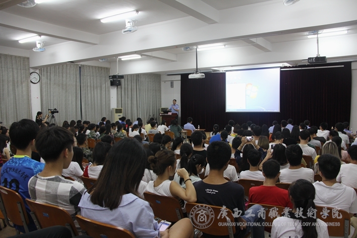 6月份是全国禁毒月,为进一步加强校园禁毒宣传教育力度,提高师生的禁毒意识,做好毒品预防教育工作。2017年6月15日晚上,我院邀请广西第一强制隔离戒毒所的多名警官和一名戒毒学员在校本部教学楼报告厅开展国际禁毒日宣传讲座。