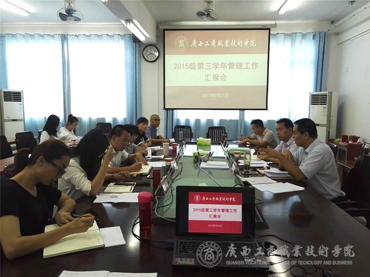 2017年9月21日下午3时,我院召开2015级第三学年管理工作汇报会。学院院长陈杰,副院长李维出席了会议。教务科研处、学生工作部相关领导,各系部主任或负责顶岗实习工作领导以及各系顶岗实习秘书参加了会议。会议由李维主持。