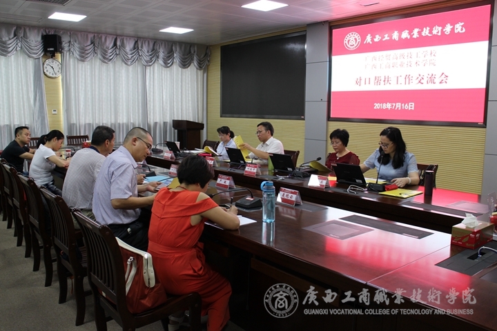 2018年7月16日上午,广西经贸高级技工学校校长助理叶艾仲一行6人到访我院。他们此行主要就该校主持、我院参研的《基于对口帮扶中高职衔接“立体交互式”人才培养的研究与实践 ——以会计和电子商务专业为例》(A类课题)立项项目结题准备工作进行学习交流,同时学习和了解参与我院主持的重大招标课题《职业院校常规管理应用研究与实践》(课题编号:GXZJ2016ZD33)取得的阶段性成果。