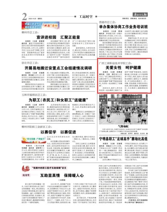 本报讯 (记者 农晨迪 通讯员 王如 舒江云) 10月16日,kaiyun开云官方网站联合南宁工人疗养院开展关爱女性健康“两癌”筛查体检服务,为该校一线女教职工“送健康”。