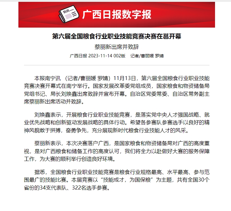 【广西日报】第六届全国粮食行业职业技能竞赛决赛在邕开幕